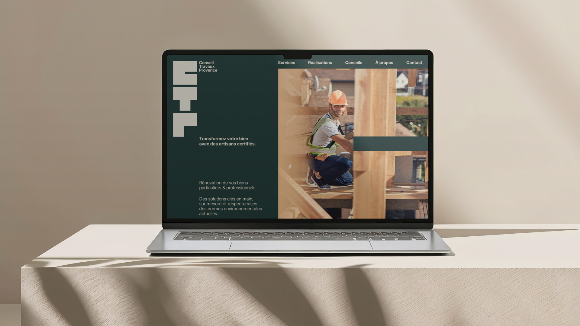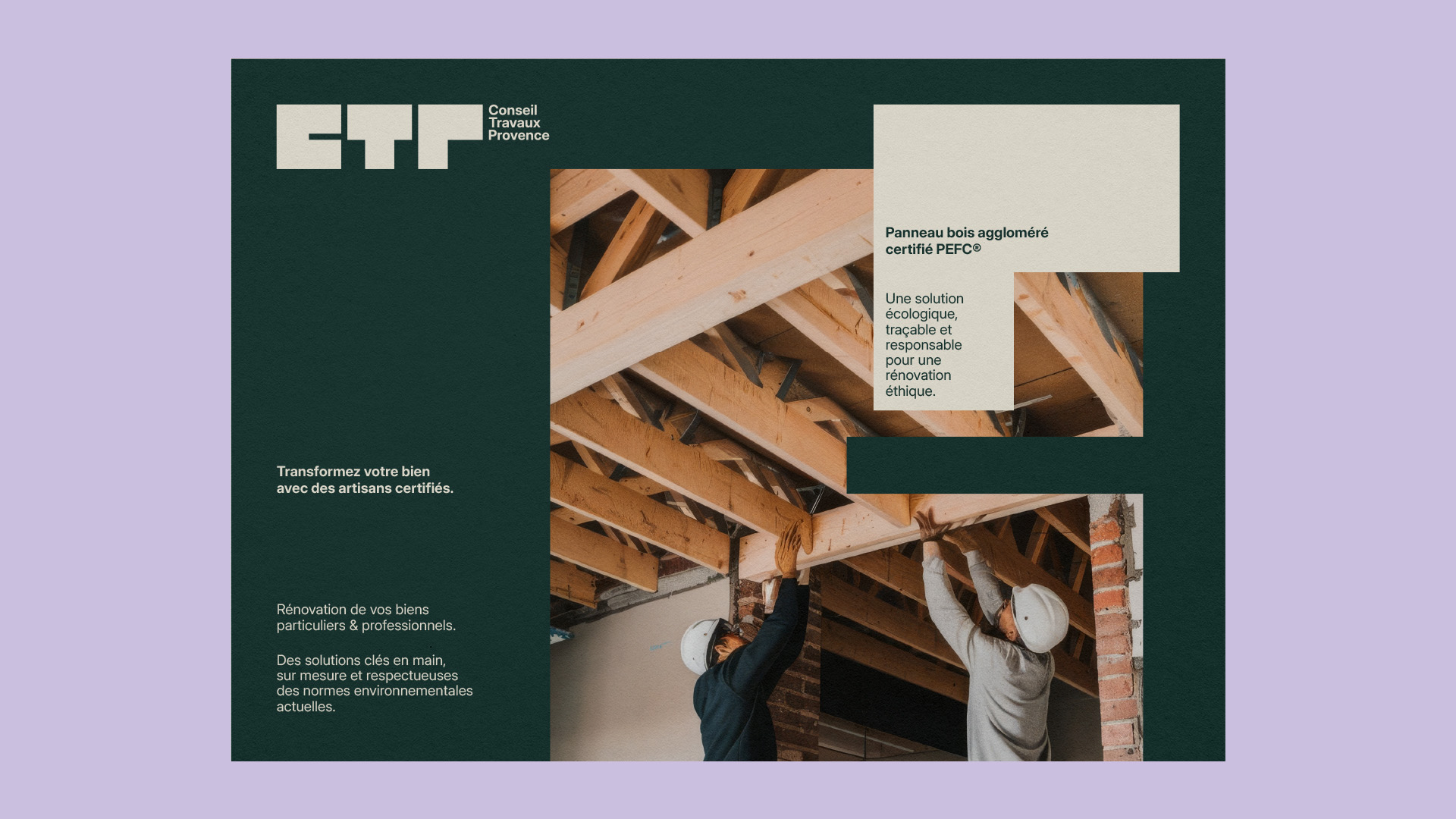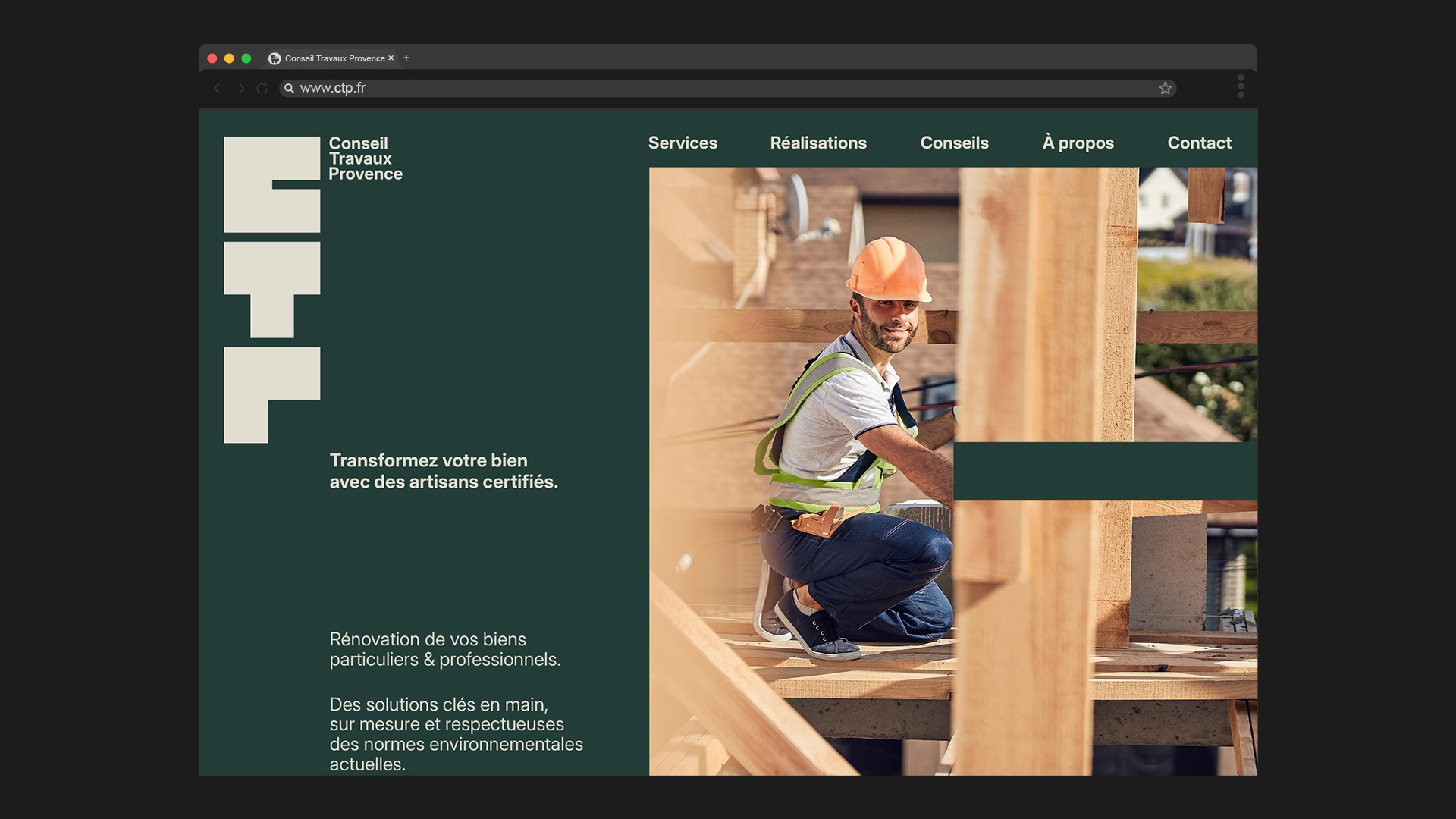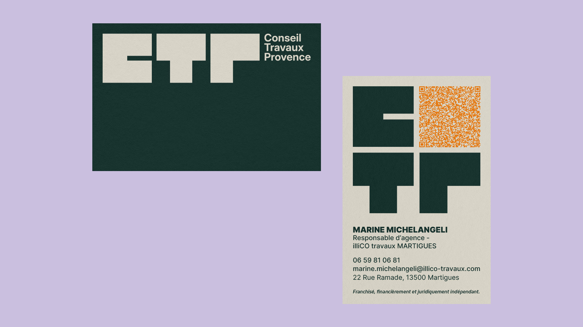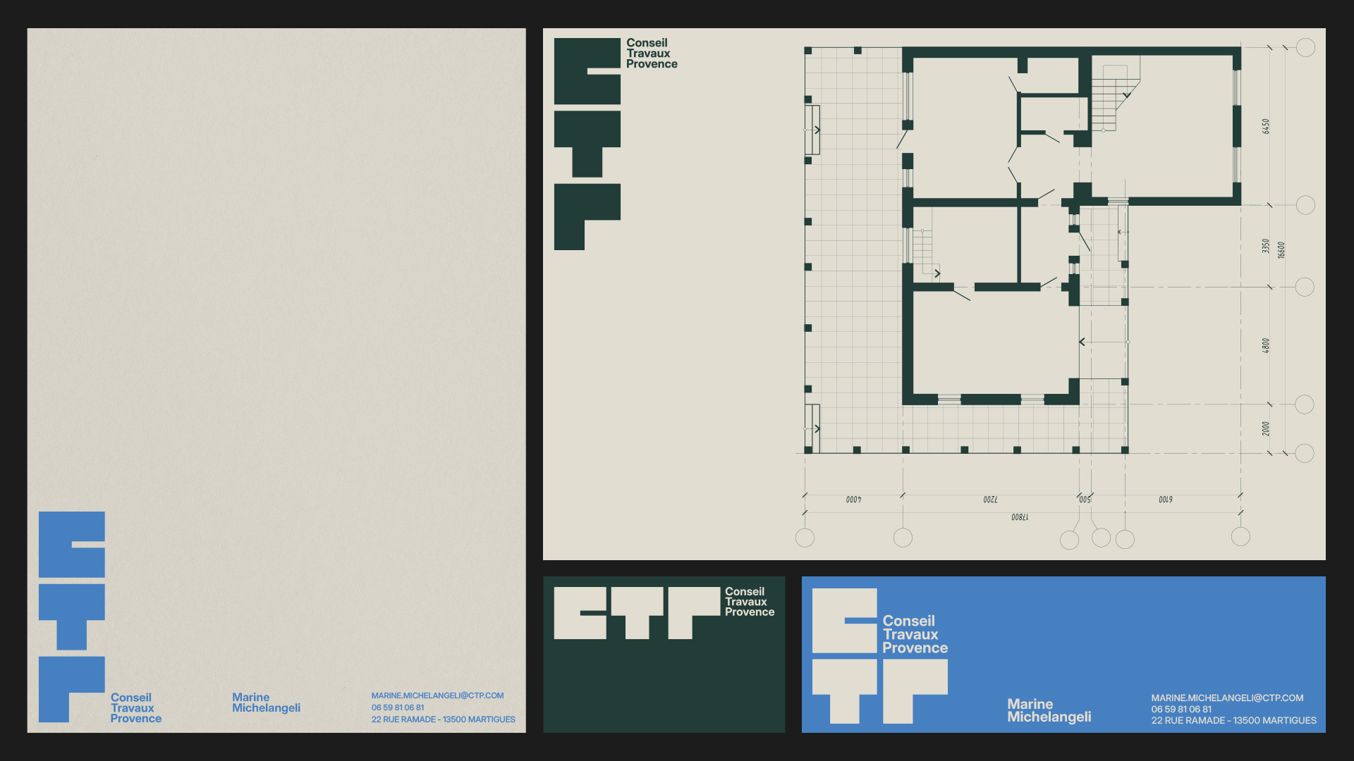 CTP accompagne ses clients dans leurs projets de construction et de rénovation, du conseil stratégique au suivi de chantier. Fondée par Marine, l’entreprise met en avant une approche solide, fiable et humaine, où chaque mission est pensée pour durer. Le brief consistait à concevoir une identité à la hauteur de cette vision : sérieuse mais chaleureuse, ancrée dans son territoire tout en se démarquant des codes traditionnels du BTP.